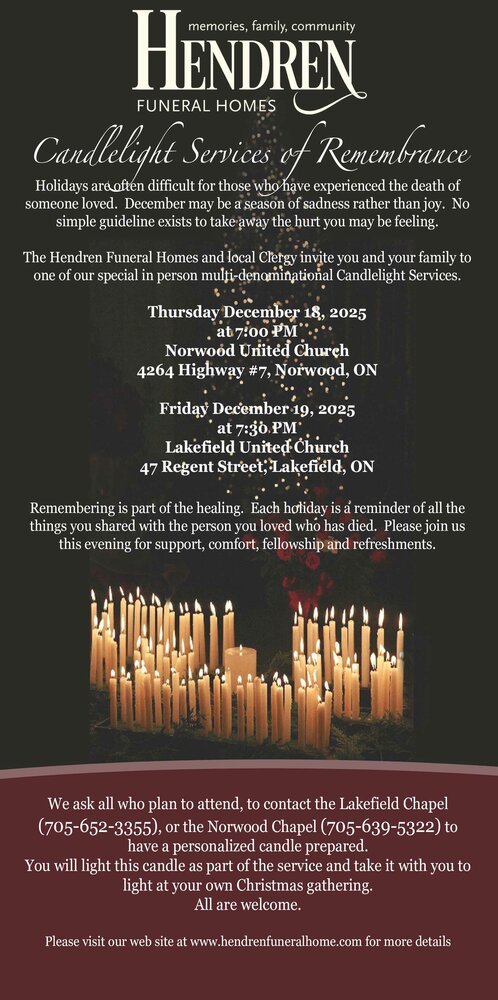 We are pleased to announce the dates for our 2025 Candlelight Service of Remembrance to be held on Thursday December 18, 2025 in Norwood and Friday December 19, 2025 in Lakefield.